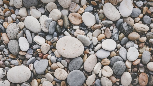 Naklejka premium Smooth pebbles and stones on a beach with textured gray and white rocks in...