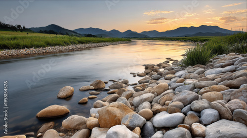 © visoot, Fototapeta premium Smooth river landscape with flowing water, rocky riverbank, green grass, distant mountains, and sunset sky reflecting on surface