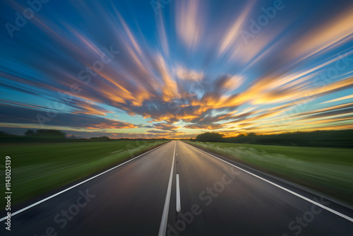 © abdulmoizjaangda, Naklejka premium Smooth road extends under vibrant, moving clouds and glowing sky