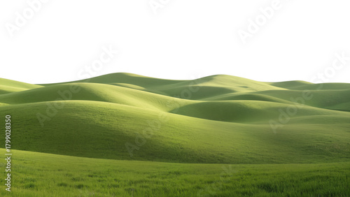 © Alex Pro, Naklejka premium Smooth rolling green hills under a pale sky, minimalist natural landscape with serene atmosphere and soft wave-like shapes.
