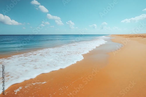 © Liza, Fototapeta premium Smooth sandy beach with gentle waves under a serene sky