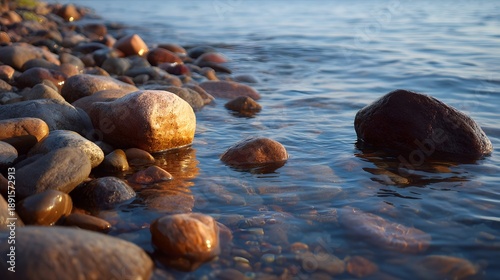 © Thares2020, Obraz premium Smooth wet stones at the water s edge reflect warm sunlight on a peaceful shore