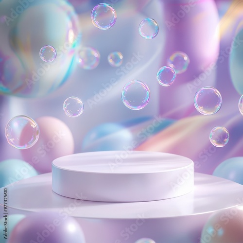 © Philipp, Obraz premium Smooth white platform in a whimsical, pastel pink setting with floating bubbles. Product advertisement & promotion concept.