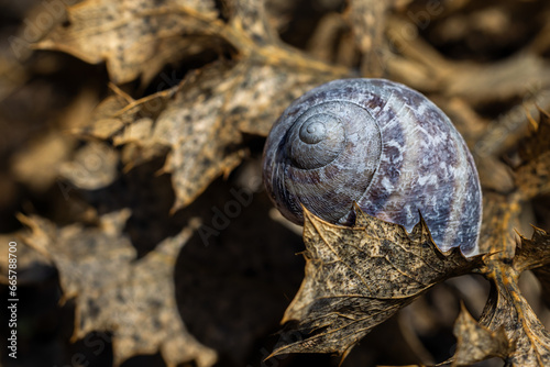 Fototapeta premium Snail shell between dry leaves.