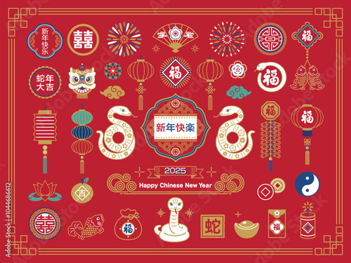 Fototapeta premium 2025 snake and Chinese new year icon set, vector, illustration