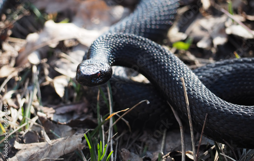 © Sergii Mironenko, Fototapeta premium Snake black laying on the grass hunting attack