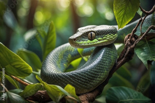 Obraz premium Snake Coiled on a Jungle Branch: A sleek green tree python coiled gracefully...