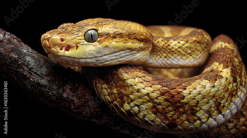 © suldev, Fototapeta premium Snake Coiled on Branch with Intense Gaze in Dark Environment