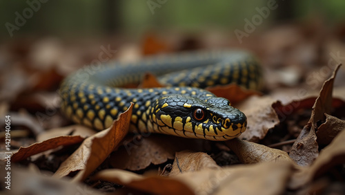 Fototapeta premium Snake Coiled on Fallen Leaves