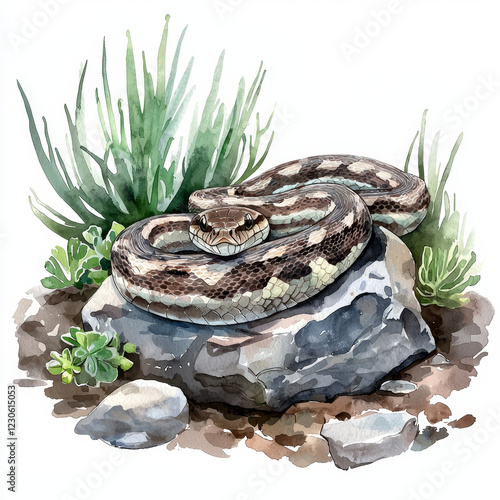 © watz, Naklejka premium Snake Coiled on Rock Among Greenery.