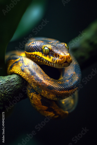 © Jiranun, Fototapeta premium Snake coiled up on a branch