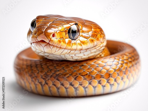 © nuiiko, Obraz premium Snake concept. Shiny, colorful snake coiled with a smooth texture and bright eyes on a light background.