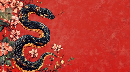 © SepazWorks, Obraz premium Snake design with floral patterns on red backdrop.