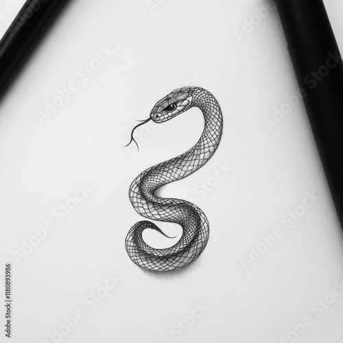 © Thirasit, Fototapeta premium Snake Drawing Detailed Render Ink on Paper Coiled Reptile Black and White Scales Tongue Artwork