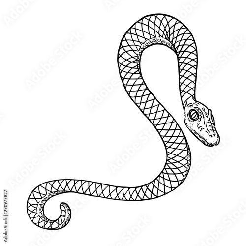 © desertsands, Fototapeta premium Snake drawing illustration. Black serpent isolated on a white background tattoo design. Venomous reptile, drawn witchcraft, voodoo magic attribute for Halloween. Vector.