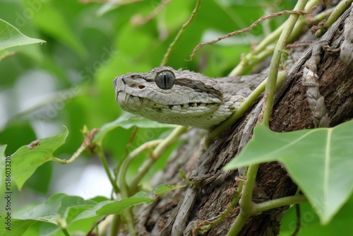 © Bojan, Obraz premium Snake gracefully slithers along a textured tree trunk, blending with vibrant vines