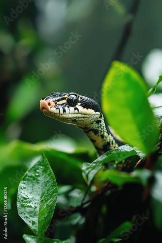 © Vasiliy, Obraz premium Snake head among green leaves against blurred background. Wildlife macro
