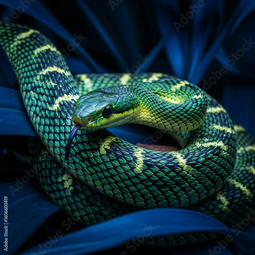 © Sumanta, Fototapeta premium snake on a branch. close up of a snake. Striking snake coiled with tongue out in dark blue foliage.