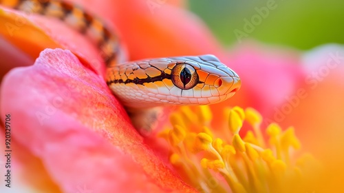 © Nehtott, Obraz premium Snake on a Flower: A small, colorful snake resting on a bright, blooming flower.