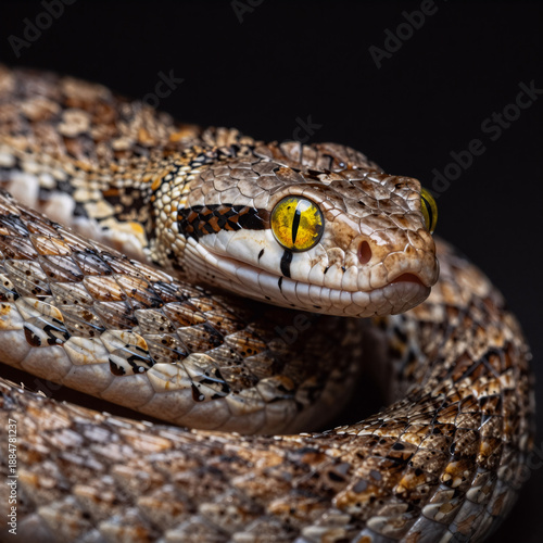 © Pixel Matrix, Obraz premium Snake portrait with yellow eyes on black background (Reptile, Wildlife)