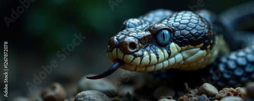 Obraz premium Snake's head close-up with piercing blue eyes and forked tongue exposed , ,...
