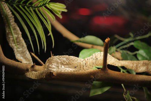 © Towfiqu Barbhuiya , Fototapeta premium Snake skin on a branch in a dark environment