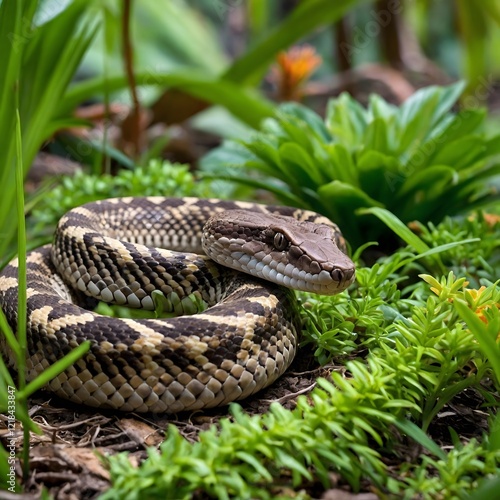 © KeeriwalaGamage, Obraz premium Snake Slithering Over Rainforest Floor Amidst Ferns and Leaves