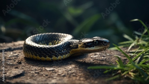 © Oleksandr, Fototapeta premium Snake with Yellow Scales Coiled on a Stone
