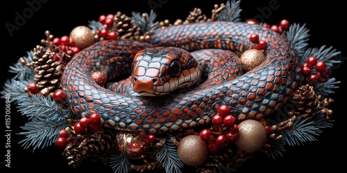 Fototapeta premium Snake wreath vibrant scales, pine cones, berries festive symbolism, New Year...