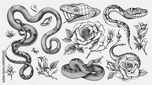 © vixion, Fototapeta premium Snakes and Roses Illustration
