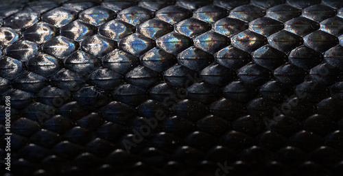 © Volodymyr, Fototapeta premium Snakeskin scales. Exotic reptilian pattern. Macro close-up scaly snake skin. Snake scale pattern. Black snake scales. Leathery snake texture. Snakes scales detailed reptilian texture.