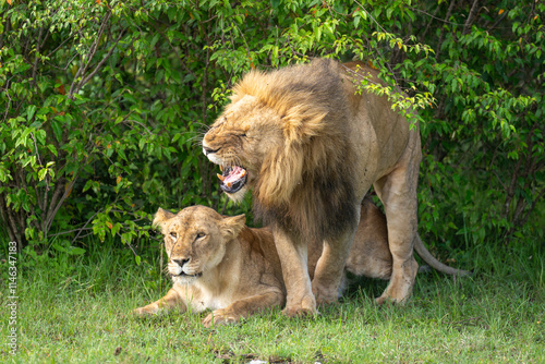 © Nick Dale, Fototapeta premium Snarling lion steps off lioness after mating