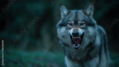 © vlntn, Obraz premium Snarling Wolf in Dark Forest Closeup