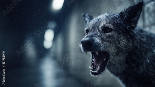 © vlntn, Fototapeta premium Snarling Wolf in Rainy Urban Night