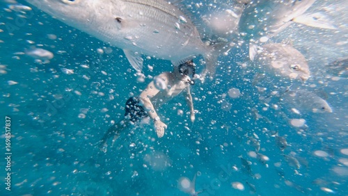 Fototapeta premium Snorkeler among fish and bubbles in blue sea, Isla de Lobos