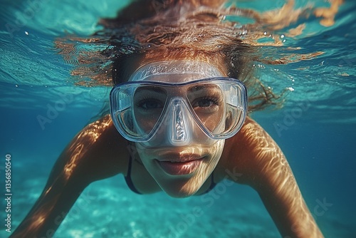 Fototapeta premium Snorkeling adventure in clear tropical waters featuring a joyful swimmer with a mask