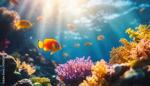 Fototapeta premium Snorkeling in a vibrant coral reef, dynamic underwater scene, soft lighting,...