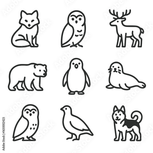 Obraz premium Snow Animals Icons. Outline icon set of snow animals and wildlife: arctic fox, snow owl, reindeer, polar bear, penguin, seal,