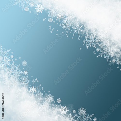 © britaseifert, Fototapeta premium Snow background blue. Christmas snowfall with defocused flakes. Winter concept with falling snow. Holiday texture and white elements.