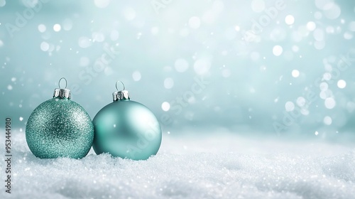 © Thanthara, Fototapeta premium snow background with light green baubles ornaments on light teal background