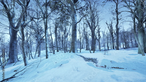 Fototapeta premium Snow blankets the ground in a tranquil forest, with tall trees standing bare...