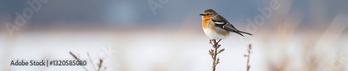 © Pimchada, Fototapeta premium Snow bunting perched on top of common reed with snow-covered background, nature, feathered, cold
