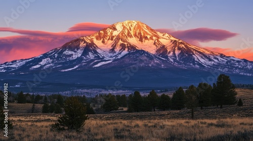 Fototapeta premium Snow-capped mountain bathed in evening light with vibrant clouds and serene landscape in the foreground during twilight hours