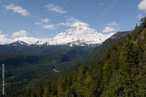 Fototapeta premium Snow-Capped Mountain Overlooking Lush Green Valley with Dense Forest Under...