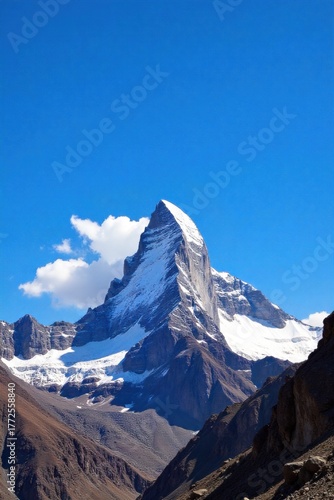 Fototapeta premium Snow Capped Mountain Peak Landmark in Daylight A majestic snow capped mountain peak under a clear, bright blue daylight sky. The surrounding landscape is rugged and natural, with hints of rocky