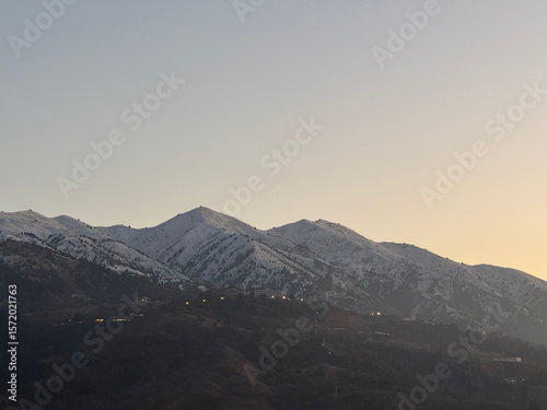Fototapeta premium Snow capped mountain peaks against a clear twilight sky. Scenic mountain range landscape at dusk with lights from a village below.
