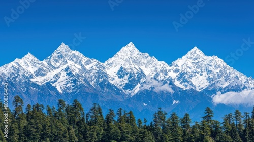 Fototapeta premium Snow capped mountain peaks towering over evergreen forest under blue sky