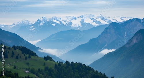 © sugio, Obraz premium Snow-Capped Mountain Range Landscape.