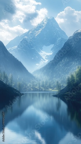 © Landscape Planet, Fototapeta premium Snow-Capped Mountain Reflected in a Calm Lake Surrounded by Forested Peaks on a Clear Day