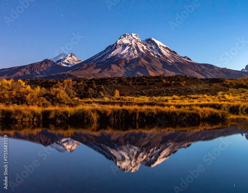 © Turbo, Fototapeta premium Snow-capped mountain reflected in still lake, autumn colors